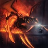 Description: A close up of a giant demon with spiral horns, roaring and on fire.
